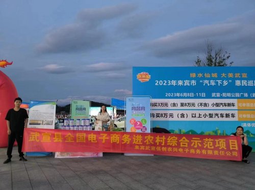 为了进一步推动武宣县国家级电子商务进农村综合示范项目,宣传推广和销售武宣特色农产品,2023年6月8日-6月11日,武宣县电子商务公共服务中心联合“汽车下乡”助力乡村振兴农产品展销活动在武宣县阳明公园广场(武仙古城)圆满结束。